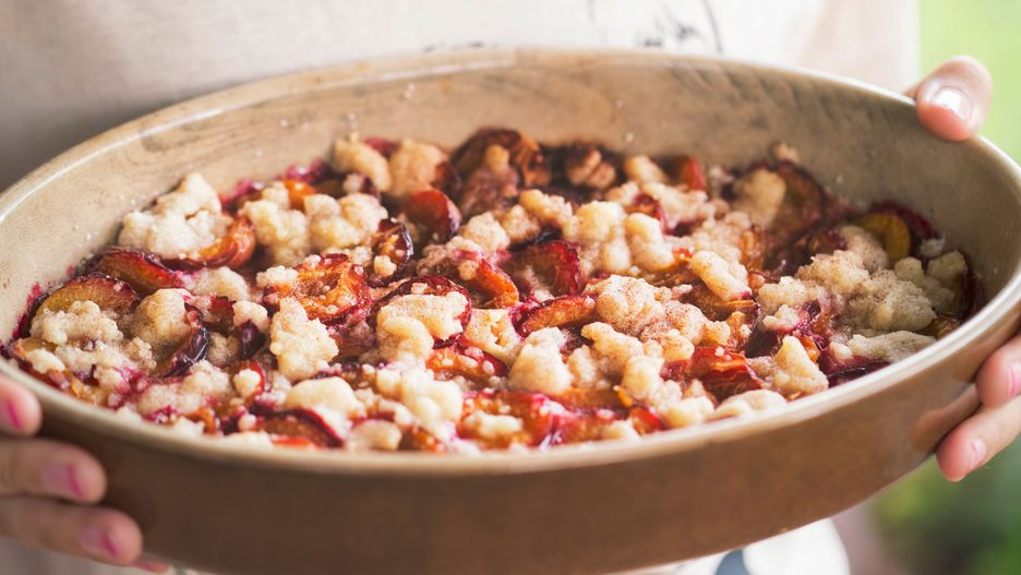 Pod taką kruszonką możesz zapiec nie tylko śliwki, ale także jabłka, morele lub winogrona. Jesienią warto dodać szczyptę przypraw korzennych – możesz wybrać cynamon, kardamon, ziarenka wanilii lub mielone goździki. Deser najlepiej smakuje na ciepło z porcją lodów waniliowych lub sosem angielskim.