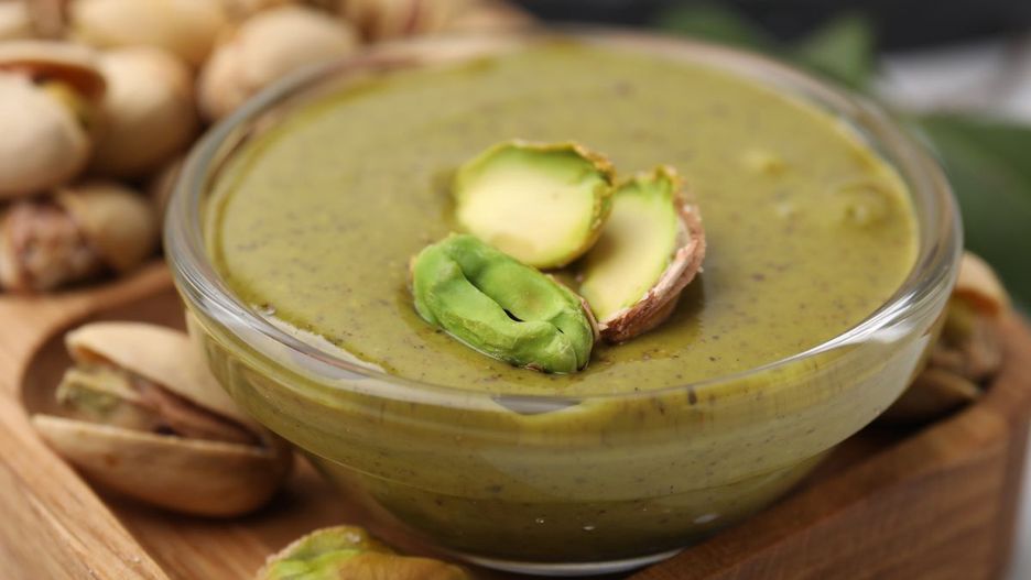 - Pistacje obierz z łupin i upraż w piekarniku (lub na patelni). Odstaw do ostygnięcia, a następnie zmiksuj przy pomocy blendera ze szczyptą soli i, opcjonalnie, 1-2 łyżkami oleju rzepakowego – olej dodawaj stopniowo do uzyskania gładkiej konsystencji.
