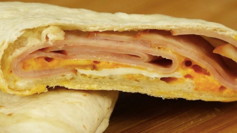 Poniżej zobaczysz przepis na przyrządzenie kanapki z placka tortilli z szynką, serem i jajkiem.