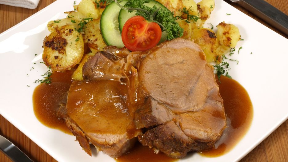 Karkówka po sandomiersku wychodzi krucha i delikatna. To zasługa soku, w którym się piecze