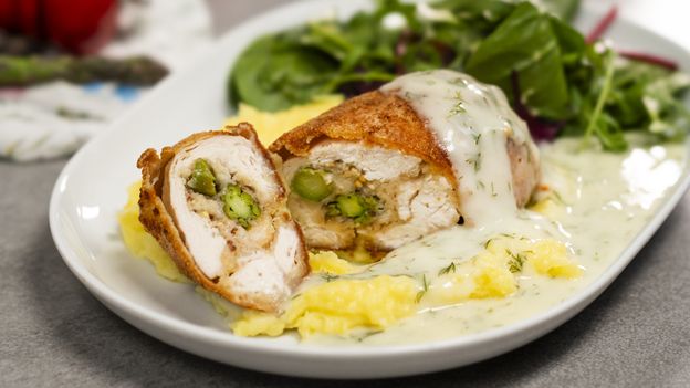 - Jako farsz wykorzystaj też starty na tarce ser i kawałki zielonych szparagów.