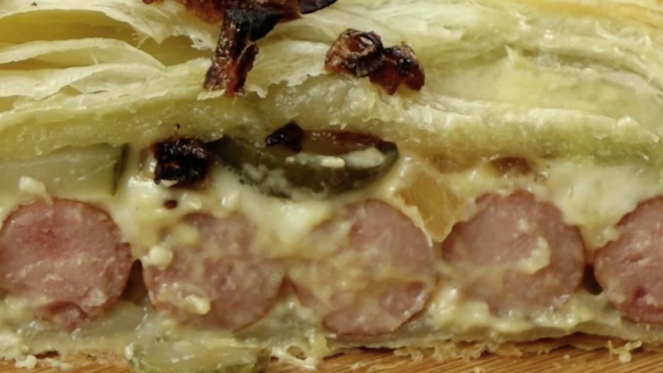 Poniżej zobaczysz przepis na przyrządzenie kiełbasek w cieście francuskim z musztardą, serem, ogórkiem i cebulką.