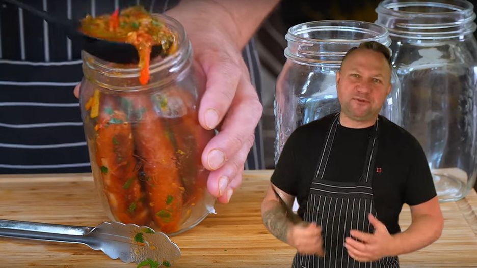 Strzelczyk stanął przed kamerą i zrobił najbardziej wyjątkowy obiad. Kiełbaski w słoiku wytrwają wiele miesięcy