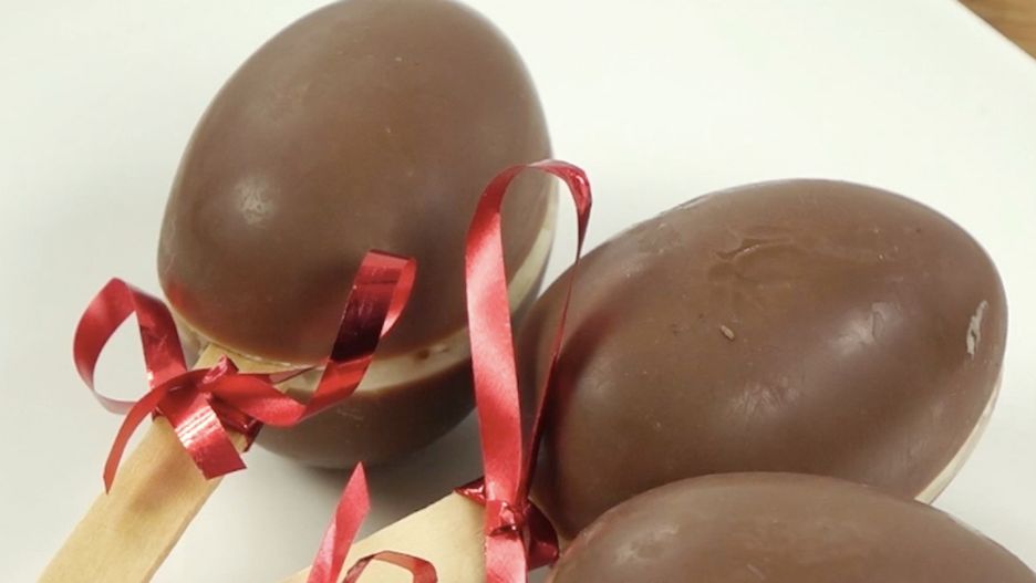3. Każde czekoladowe jajko przedziel na pół. Do każdej połówki nałóż przygotowane nadzienie. Do 4 połówek przylep po jednym patyczku, a następnie przykryj je czterema pozostałymi połówkami jajek. Rób to bardzo ostrożnie i delikatnie, aby jajko nie pękło.