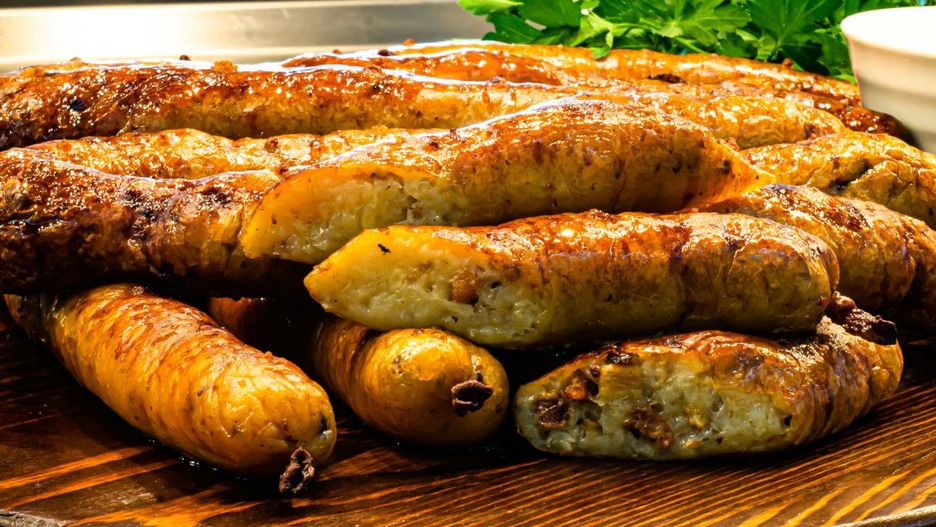 Następie kroimy w kostkę boczek surowy (kilogram) oraz wędzony (pół kilograma), po czym podsmażamy, podobnie jak drobno posiekane cebule (kilogram). Mieszamy wszystkie składniki, dodajemy surowe jajko oraz kaszę mannę (pół szklanki). Doprawiamy solą, pieprzem, suszonym majerankiem lub tymiankiem.