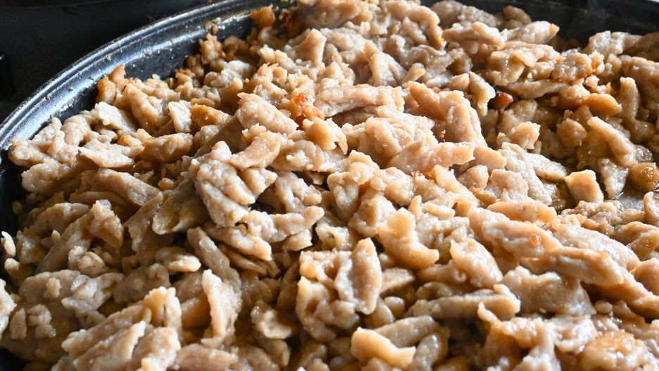 - Trzymając miskę tuż nad wrzątkiem, odrywaj łyżką pojedyncze, małe porcje ciasta i wrzucaj bezpośrednio do wody. Jeśli ciasto zacznie przyklejać się do sztućca, zanurzaj łyżkę na sekundę w gotującej się wodzie przed nabraniem kolejnej porcji.