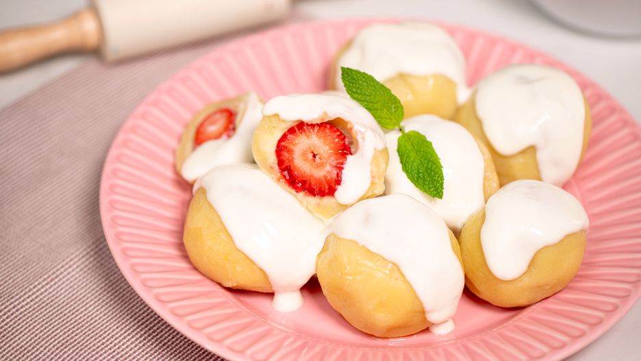 - Każdy kawałek spłaszcz, na środku połóż truskawkę i zlep brzegi, formując kulki.