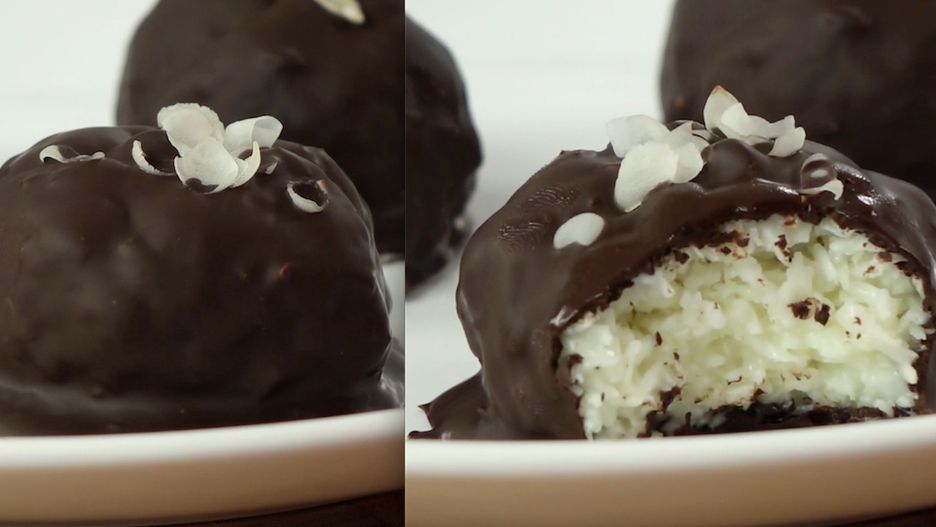 5. Roztop gorzką czekoladę wraz z olejem kokosowym i odstaw, aby polewa ostygła. Kiedy ostygnie, wyjmij kulki z lodówki i każdą z nich zanurz w mieszance.