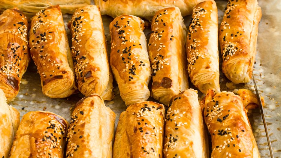 - Ciasto filo kroję na prostokąty. Na każdy kładę porcję farszu, zawijam boki i zwijam w kształt cygara. Smaruję roztopionym masłem i opcjonalnie posypuję sezamem.