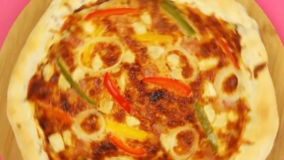 Kolorowa pizza na cieście Hot-Dog z kurczakiem, papryką, boczkiem i cebulą inspirowana przepisem z menu Domino's Pizza