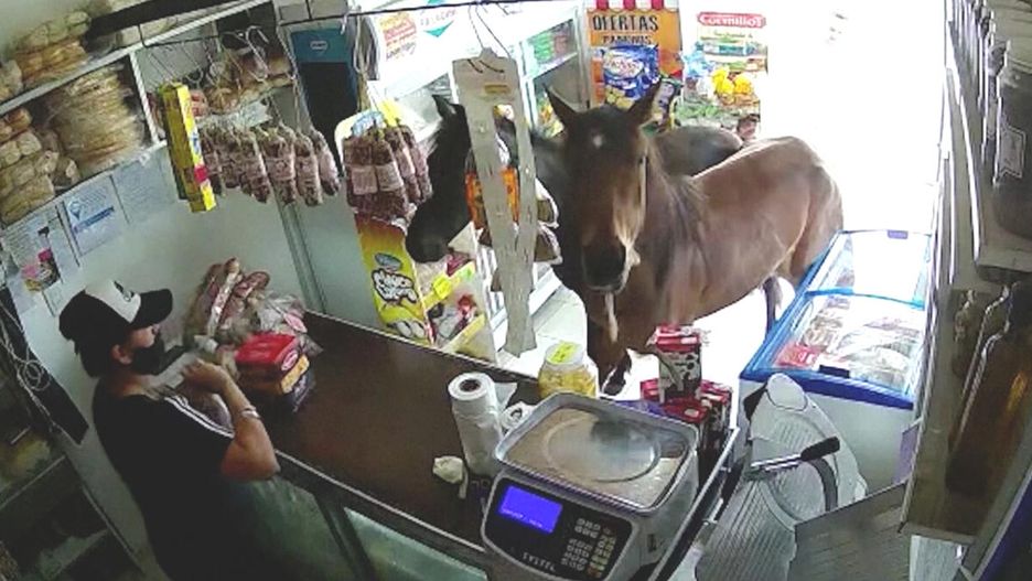 Na nagraniu z kamery zamontowanej wewnątrz sklepu możemy zauważyć mężczyznę wychodzącego z zakupami. I nie byłoby w tym nic zaskakującego gdyby nie to, że tuż za nim do sklepu wszedł... koń. Tak – to były konie w sklepie na zakupach! Jak się zachowywały? Śmiało przechadzał się między półkami, strącając pyskiem towary i robiąc bałagan.