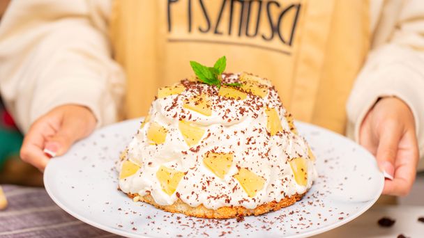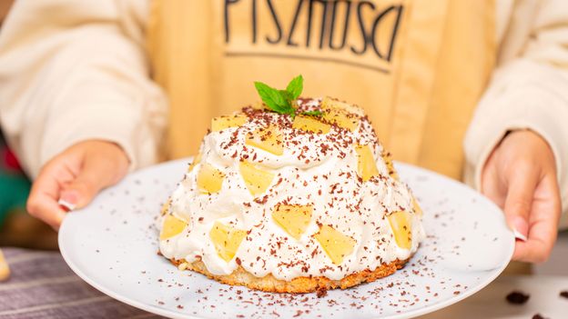 - Gdy uzyskasz już formę kopy, rozprowadź na jej powierzchni ubitą śmietankę. Następnie udekoruj przy pomocy ananasa i startej na tarce gorzkiej czekolady.