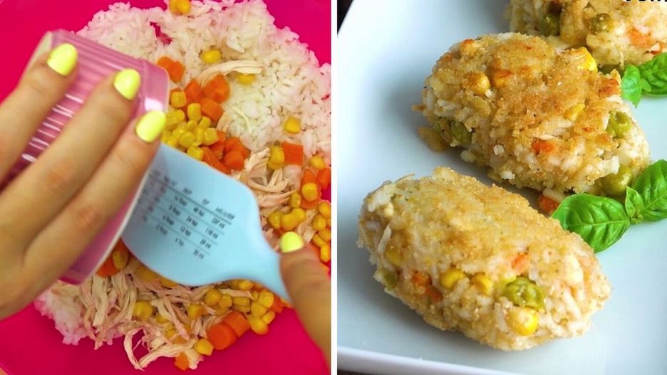 Kotleciki ryżowe z dodatkiem pysznego kurczaka i kolorowych warzyw to gotowa kombinacja obiadowa dla każdego malucha. Obiad podany w taki sposób na pewno się im spodoba! ❤️