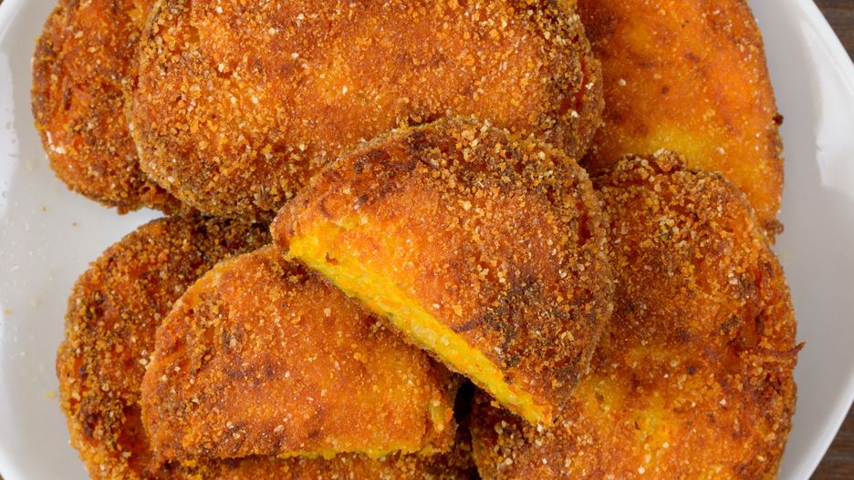 - Z masy formuj kotlety, obtaczaj je w panierce.