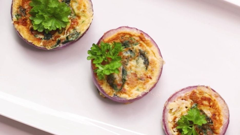Jeśli znudziły Ci się już jajka sadzone i omlety, szukasz nietypowej przekąski, którą zaskoczysz swoich gości- mamy dla Ciebie przepis, który świetnie się sprawdzi. Jajeczna mieszanka z chrupiącym boczkiem i szpinakiem zamknięta w krążkach z cebuli nie dość, że prezentuje się znakomicie, to na dodatek smakuje po prostu obłędnie.