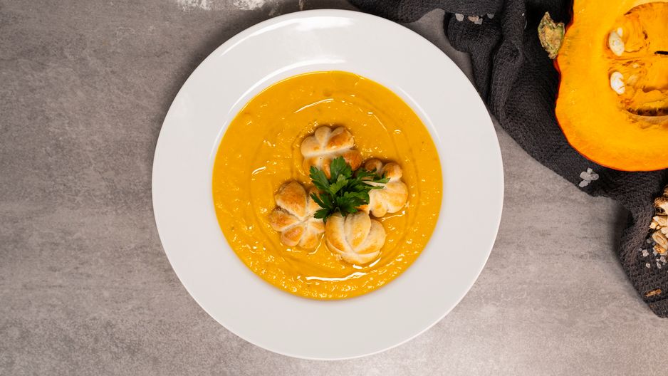 Kremowa zupa dyniowa z drożdżowymi minidyniami. W każdym dodatku czeka serowa niespodzianka