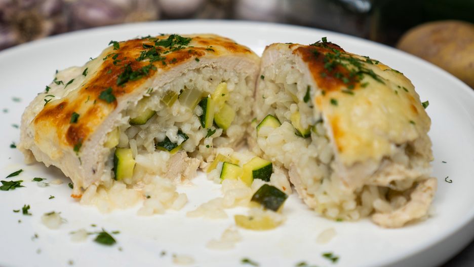 Kremowe risotto z kurczakiem i mozzarellą (kurczak faszerowany risotto). Składniki i przygotowanie