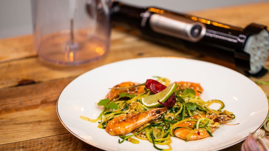 Krewetkom w naszym przepisie towarzyszy makaron z cukinii. Przygotowaliśmy go przy pomocy Zoodlera marki Philips.