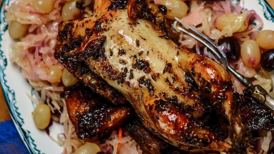 Przepis na pieczonego bażanta z kapustą kiszoną i winogronami