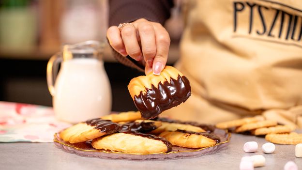 - Zanurz połowę ciasteczka w czekoladowej polewie i gotowe. Smacznego!