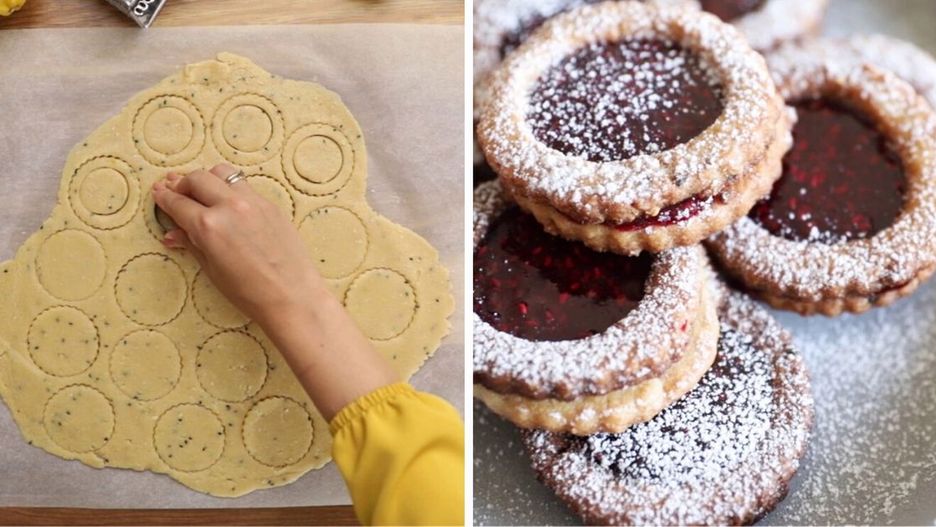 8. Na pełnych ciasteczkach ułóż część malinowego farszu. Na wierzchu ułóż ciasto z dziurką.
