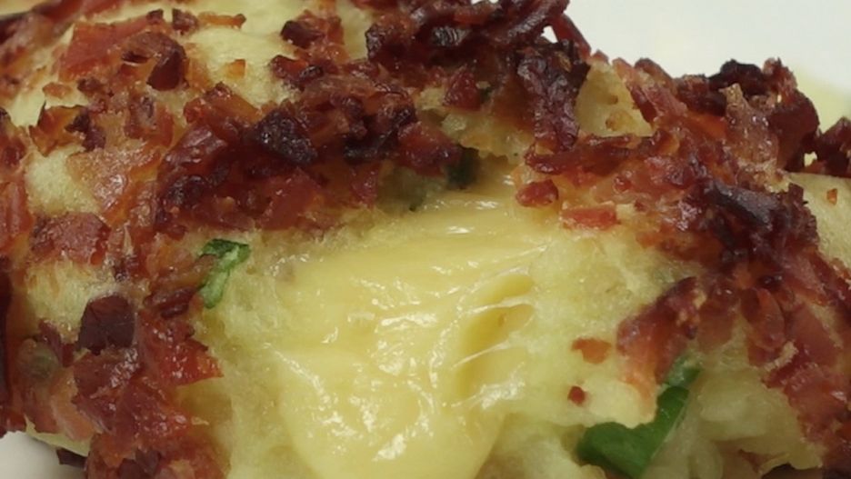 Pieczone kuleczki ziemniaczane z boczkiem, szczypiorkiem i rozpływającym się żółtym serem
