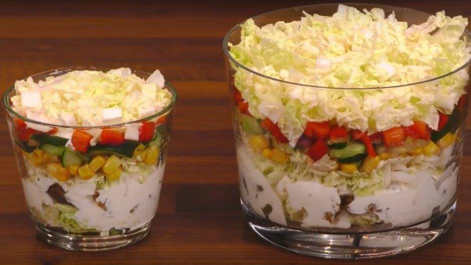 Co prawda, jest kilka wersji na tę właśnie sałatkę, ale my postanowiliśmy zaprezentować tę najpopularniejszą recepturę. Alternatywą jest tu również makaronowa sałatka gyros na Sylwestra. Niezależnie od tego, na co się zdecydujecie, musicie wiedzieć, że ta warstwowa sałatka idealnie sprawdzi się nie tylko podczas Sylwestra, ale także podczas wszelkich imprez, czy spotkań rodzinnych. Robi się ją łatwo i przyjemnie, a czas przygotowania to zaledwie około 30 minut. W przezroczystym naczyniu wygląda rewelacyjnie - kluczowe są tu bowiem warstwy tej sałatki.