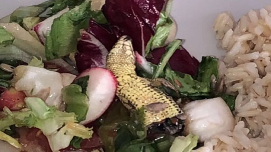 Gdy zjadła połowę sałatki, jej oczom ukazała się... jaszczurka, a właściwie jej połowa. Była to głowa i część odwłoku z wylewającymi się wnętrznościami.