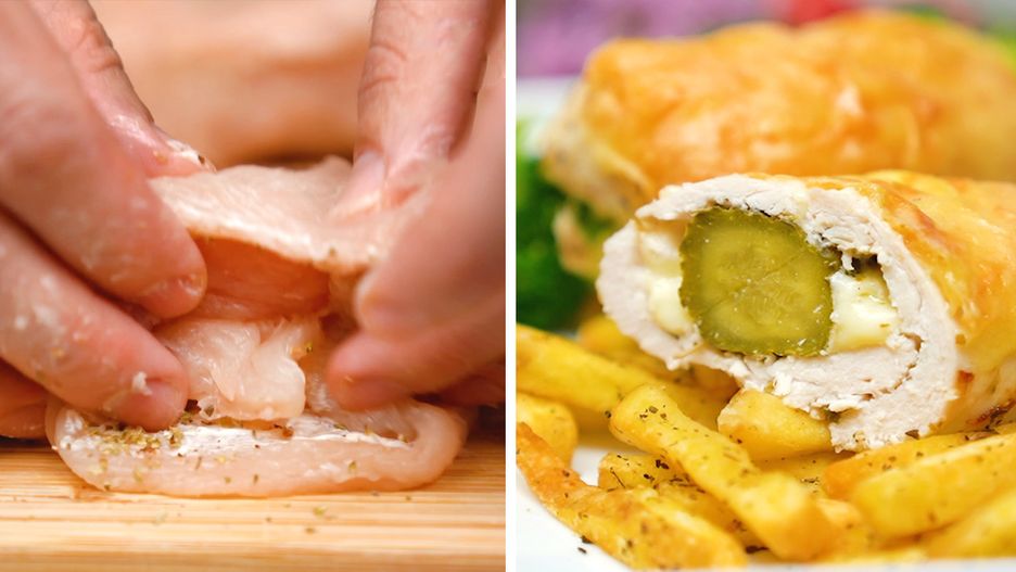 Piersi z kurczaka faszerowane serem podaliśmy dziś z domowymi frytkami. To pyszny obiad, którym zajadać się będzie Twoja rodzina. Całość zapiekliśmy w piekarniku, dzięki czemu potrawa jest lekka i nie ma w niej dodatkowego tłuszczu. Kurczak faszerowany z ogórkiem konserwowym to strzał w 10!