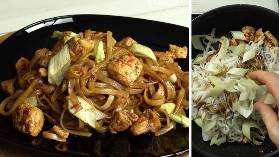 Kurczak na ostro z makaronem ryżowym