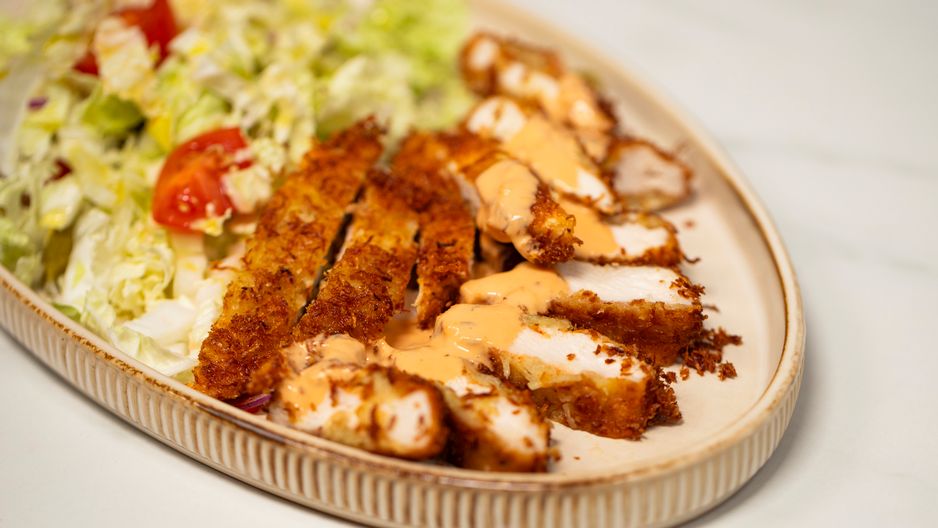 - Chrupiącego kurczaka serwuj z kolorową sałatką i ulubionym sosem.