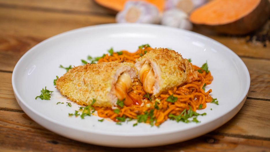 Kurczak w kokosowej panierce skrywa w sobie ser i sos słodko-kwaśny. Taka kombinacja smakowa to prawdziwa uczta dla podniebienia. Po prostu palce lizać!
