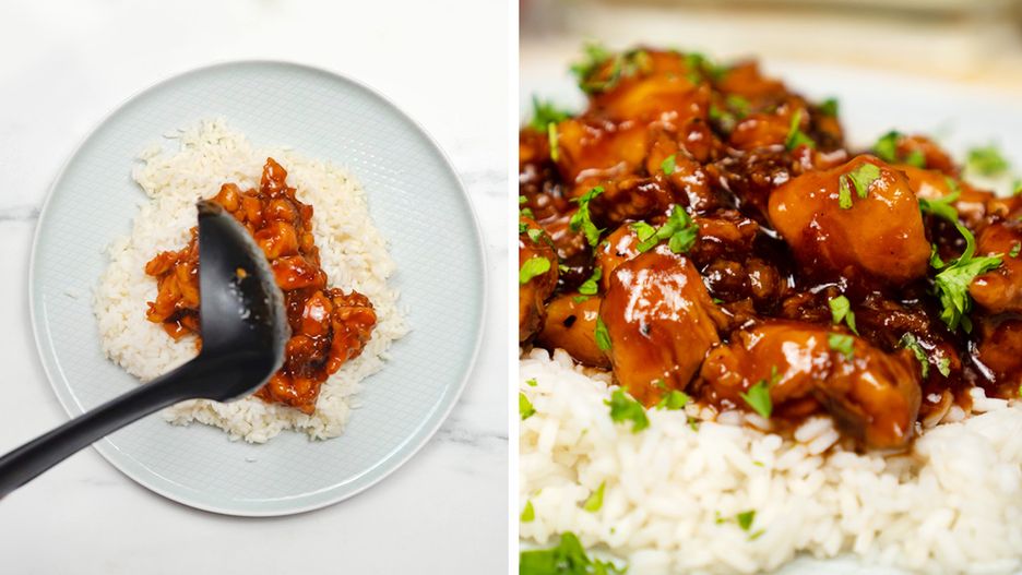 Ugotowany ryż wyłóż na talerz i dodaj przygotowanego kurczaka. Serwuj na ciepło i obserwuj, jak domownicy zachwycają się pysznym i prostym w przygotowaniu obiadem. Przed podaniem możesz całość udekorować posiekaną natką pietruszki.
