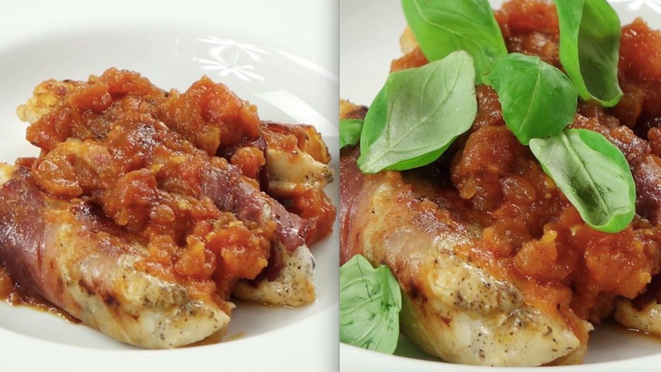Pierś z kurczaka zawijana w szynce parmeńskiej, smażona z pomidorkami