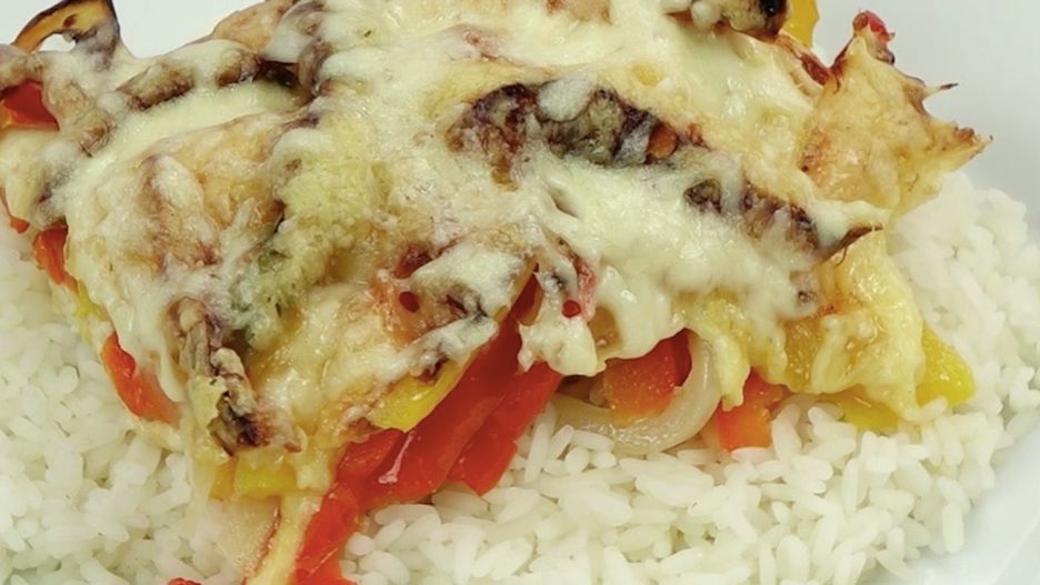 4. Po 45 minutach wyjmij naczynie z piekarnika i rozłóż zapiekankę na talerze. Podawaj z ugotowanym ryżem.