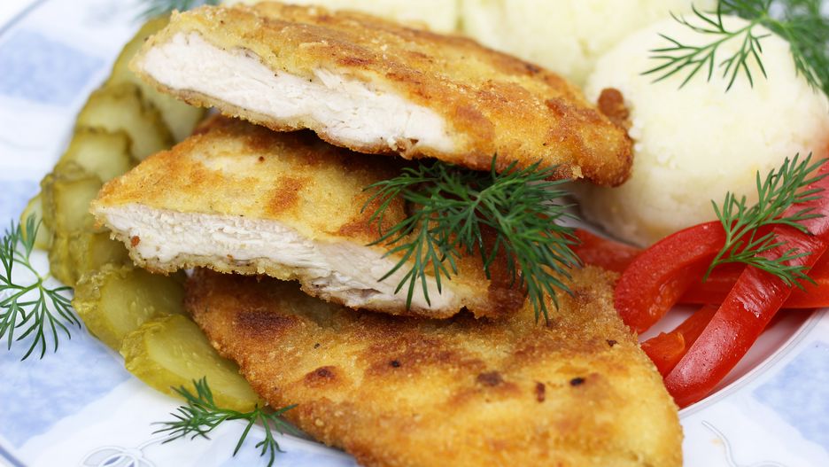 Po wyjęciu z lodówki wystarczy lekko strząsnąć nadmiar marynaty — nie trzeba jej dokładnie usuwać, bo nie przeszkadza w panierowaniu. Wręcz przeciwnie: cienka warstwa jogurtu pomaga bułce tartej lepiej przylegać do mięsa, dzięki czemu panierka po usmażeniu jest równa i chrupiąca, a wnętrze pozostaje soczyste.