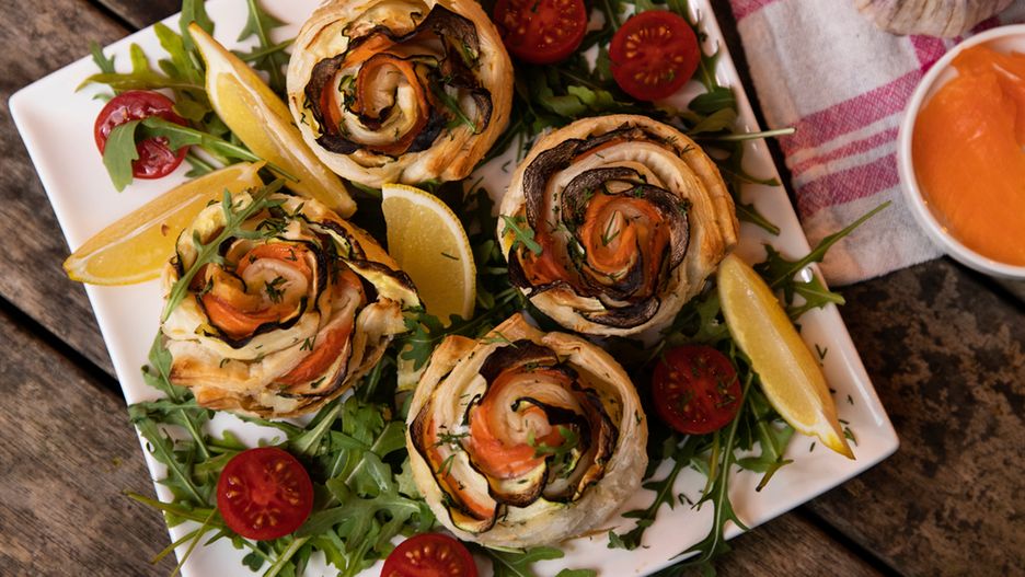 Kwiatki z ciasta francuskiego z wędzonym łososiem