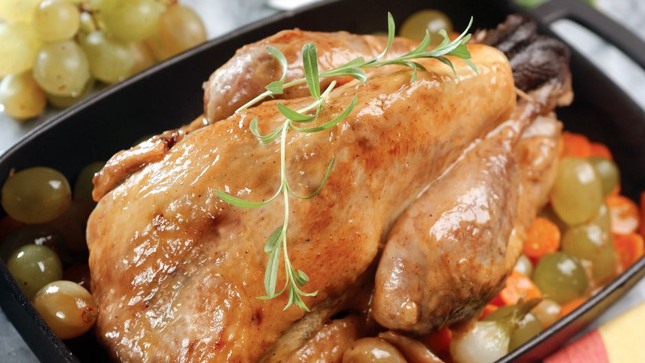 - Wstaw perliczkę do pieczenia. Piecz przez około 2 godziny (zależy od wagi) w piekarniku, co 15 min podlewając płynem. Gdy skórka zacznie się przypiekać za bardzo, przykryj folią. Podawaj z pieczonymi ziemniakami lub purée.