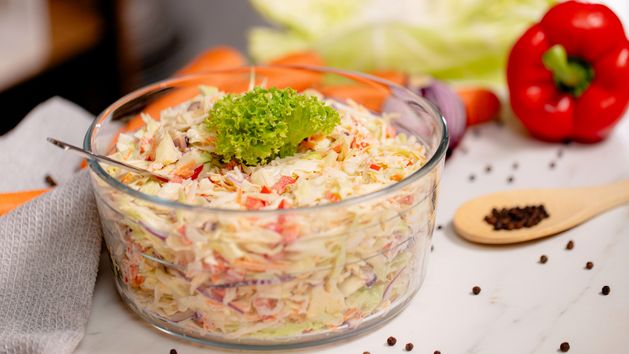 Letnia surówka obiadowa to kolorowe, chrupiące warzywa połączone delikatnym sosem majonezowym. Przygotujesz ją z młodej kapusty, słodkiej papryki, soczystej kalarepy, marchewki i czerwonej cebuli. To szybki i lekki dodatek do obiadu, który świetnie pasuje zarówno do dań mięsnych, jak i wegetariańskich. Wystarczy poszatkować kapustę, pokroić lub zetrzeć warzywa, doprawić solą, pieprzem i wymieszać z majonezem.