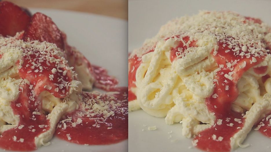 Dzisiaj jednak zaproponuję ci lody w formie spaghetti z dodatkiem musu z truskawek i białej czekolady. Wystarczy tylko trochę kreatywności i można zaskoczyć znajomych.