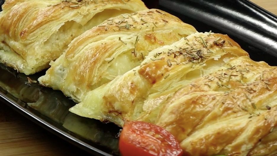 3. Ponacinaj ciasto francuskie tak, jak na poniższym zdjęciu, a następnie zawiń boki do środka tak, aby powstał warkocz. Za pomocą pędzelka nasmaruj wierzch ciasta jajkiem.