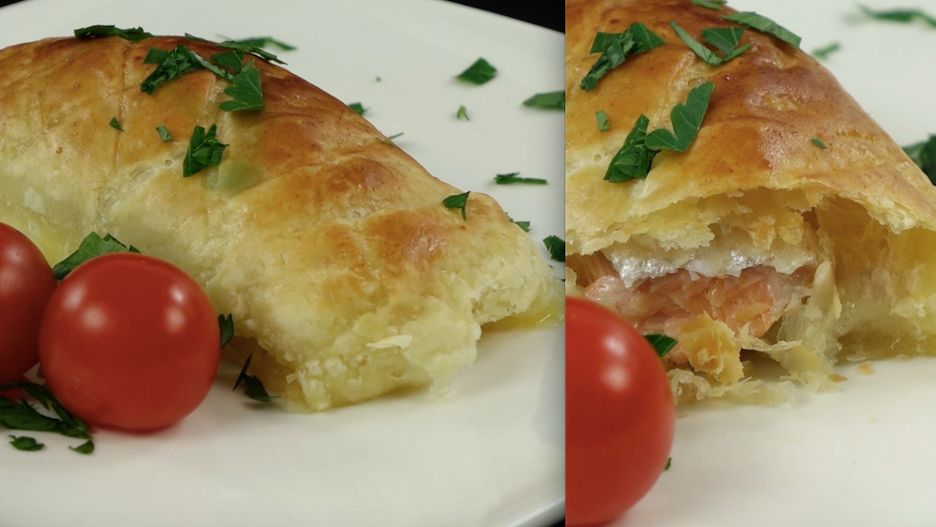 Łosoś w cieście francuskim z mozzarellą i pomidorkami