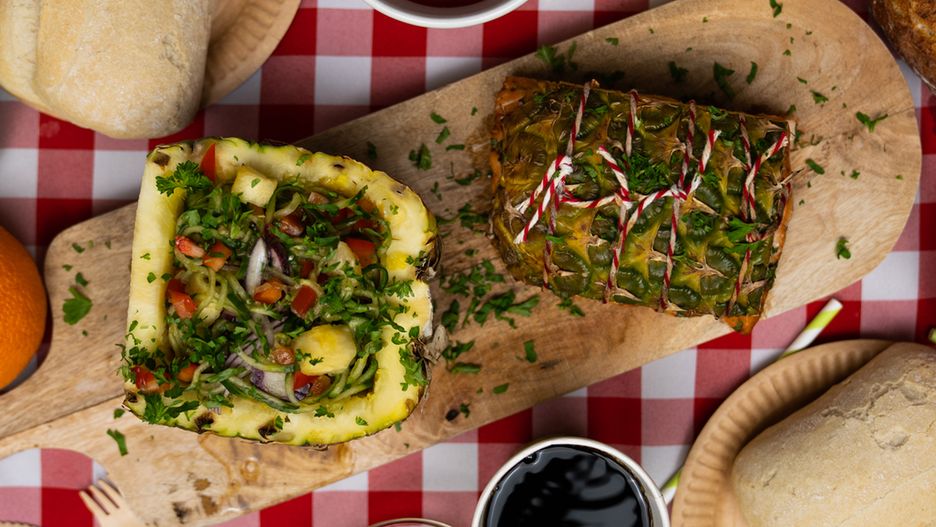 Upieczonego lub zgrillowanego łososia podaj z sałatką w miseczce z ananasa. Pyszny, letni obiad jest już gotowy.