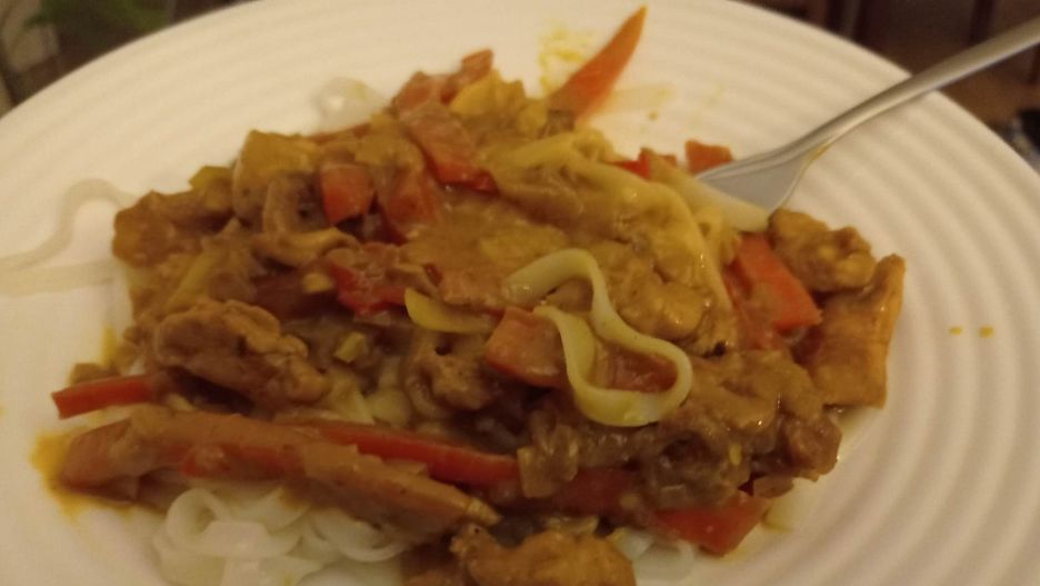 Gdy cebula się zeszkli, a kurczak zarumieni, to stopniowo dodajemy pozostałe składniki. Najpierw będą to warzywa. Gdy podczas smażenia nabiorą odpowiedniej miękkości, to możemy całość zalać przygotowanym wcześniej sosem na bazie masła orzechowego. To również dobry moment, by dodać pokrojonego ananasa. Wszystkie składniki przyprawiamy solą, pieprzem, kurkumą i imbirem. Na sam koniec możemy dorzucić garść orzechów włoskich. Makaron ryżowy gotujemy według wskazówek na opakowaniu i podajemy z przygotowanym sosem. Smacznego!