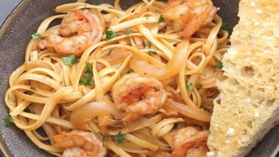 Przepyszny makaron z krewetkami, którego jak najszybciej musisz spróbować. Mmm, pyszności!