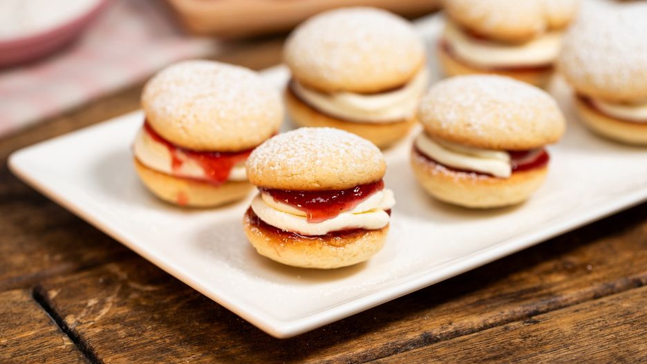 Krok 4. Upieczone biszkopciki podziel na pół. Posmaruj jedną połówkę dżemem malinowym, wyłóż krem maślany i przykryj drugą częścią. Oprósz ciasteczka cukrem pudrem.