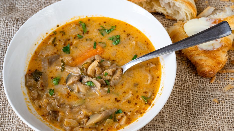Flaczki z boczniaków świetnie smakują ze świeżym pieczywem.