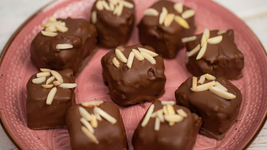Krok 6. Na koniec każdą kosteczką z ukrytym brownie dekoruję przy pomocy migdałów i odstawiam do całkowitego zastygnięcia czekolady. I to wszystko, smacznego!