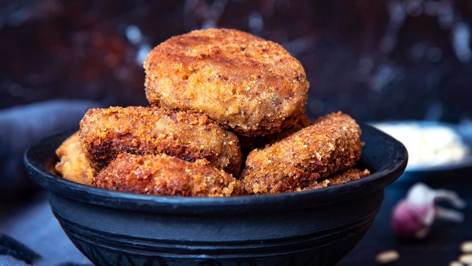 - Całość wyrób ręką, aż składniki dobrze się połączą. Z gotowej masy formuj kotlety wielkości klasycznych mielonych, obtocz je w bułce tartej i smaż na rozgrzanym oleju, aż nabiorą złocistego koloru.