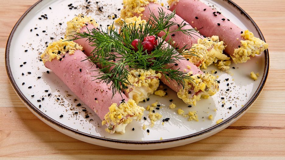 - Roladki z szynki z pastą z jajka i twarogu są gotowe do podania. Możesz je dodatkowo udekorować koperkiem lub innymi ziołami. Smacznego!